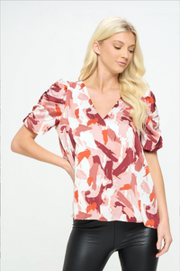 Abstract Ruched Sleeve Top CWood/Peach/Mo